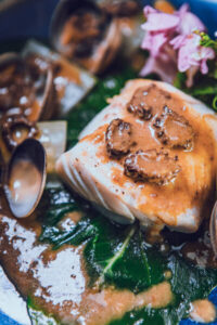 3/ Dans cette réduction faire cuite les palourdes et le dos de cabillaud 4 mn à couvert, retirer le cabillaud et les palourdes.
