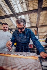 Avant de vous dévoiler notre conversation avec Fabien Galthié, nous sommes obligés de faire un arrêt sur image sur les Halles de Ganges. C’est ici que plusieurs figures locales conjuguent leurs talents : Jean-Michel Durand, chef pâtissier de la Maison Latour, et Julien Dubroc, chef du restaurant Les Docks du GR à Saint-Martin-de-Londres. Tous deux partagent un même complice et associé, Guy Giner, initiateur du stand sur lequel nous nous trouvons. On y retrouve une offre très régionale et gourmande : pâtisserie, restauration, et cave à vin tenue par Laetitia. Le temps d’enfiler un tablier, et c’est parti pour réaliser sous le regard bienveillant de Julien Dubroc la spécialité de Jean-Michel Durand : un millefeuille inversé. Un feuilletage repensé, maison, croustillant et fondant. Et c’est dans ce décor sucré que Fabien Galthié, les yeux rivés sur les vitrines, entame son récit.