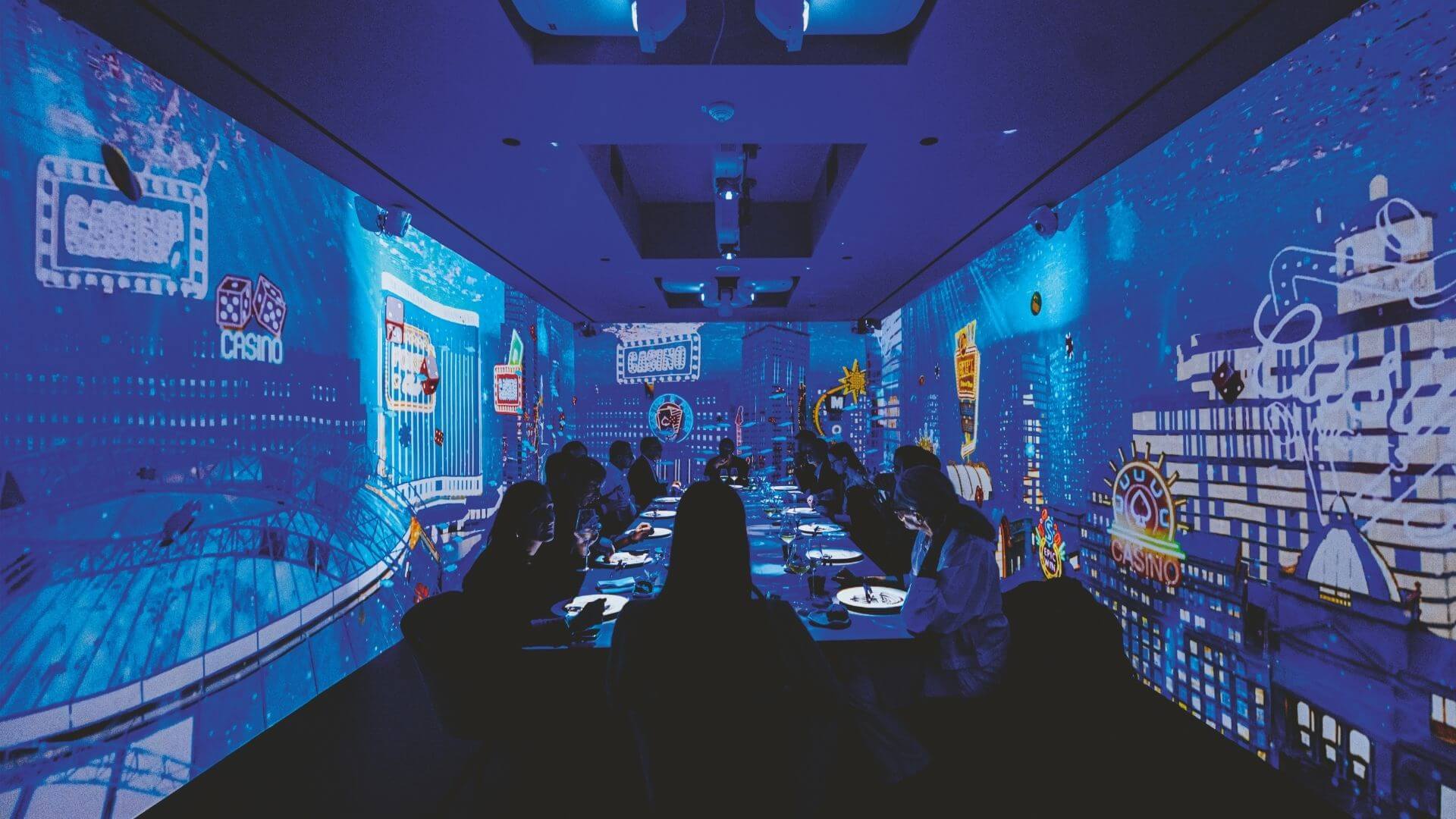 L’agence a imaginé une scénographie immersive où les scènes, inspirées de l’univers du jeu, se succèdent dans des ambiances évolutives soigneuse- ment orchestrées. Décors, lumières et narration transforment la table en scène vivante, pour une expérience intime de 14 convives mêlant curiosité et plaisir culinaire.