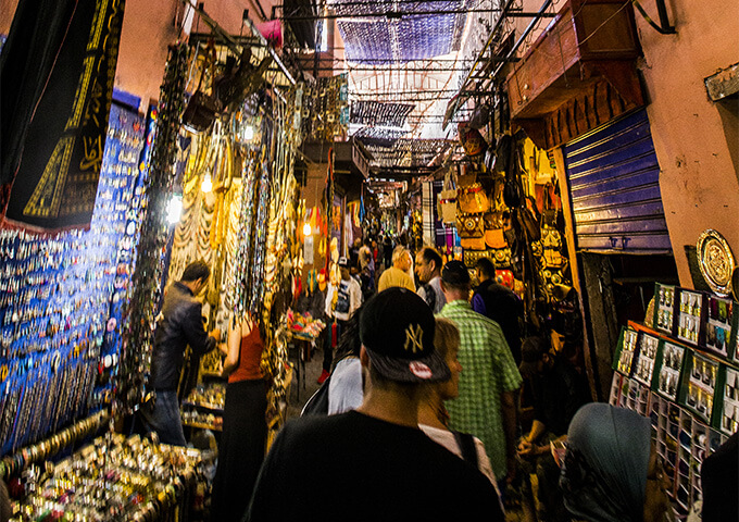 Désignant l’ensemble des ruelles commerçantes au nord de la place Jemaa el-Fna, les souks sont éminemment touristiques, ce qui n’empêche pas d’y consacrer quelques heures. D’une part, parce que la visite de ce labyrinthe d’échoppes colorées est une expérience en soi, intimement liée à l’histoire de la ville. Mais aussi car on y trouve, au-delà des babouches et des souvenirs sans intérêt, des adresses uniques.