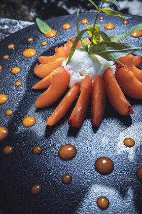 Jacques Mazerand : Un dessert qui sera proposé à la carte de l’été : l’abricot, sur un sablé muesli, crème montée à l’amande amère, verveine du jardin.