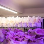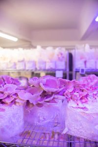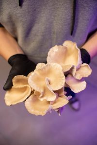 “Pour l’instant, on travaille en prêt-à-pousser. Cela nous permet d’avoir des récoltes très rapides : en une semaine, on a des champignons”, explique Bastien. Pleurotes gris, roses, jaunes, Shiitake, Pioppino, Eryngii, Black Pearl… Sept espèces choisies pour leur goût, leur esthétique, mais aussi leur capacité à pousser ensemble dans les mêmes conditions. “Certains, comme le Pioppino, mettent quinze jours. Le pleurote, en six jours, il est là”, précise Bruno, en désignant un bouquet gris perlé qui déborde d’un ballot.