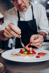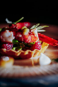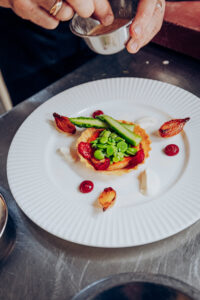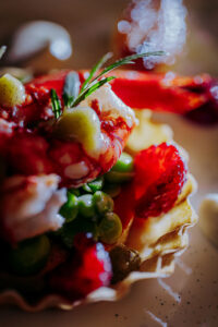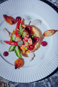 / FINITION : tailler les petits oignons et les caraméliser dans une poêle avec beurre et sucre. Cuire les gamberoni à feu doux en poêle antiadhésive avec un filet d’huile d’olive, assaisonner. Mixer les citrons confits avec jus de citron et huile d’olive pour réaliser un coulis. Poser dans chaque fond de tarte la royale de crustacés, déposer par-dessus les fèves chauffées au beurre, et encore par-dessus les gamberoni, le gel citron, et tout autour la purée d’amande et les oignons caramélisés. Terminer avec des demi-framboises et quelques pluches d’herbes.