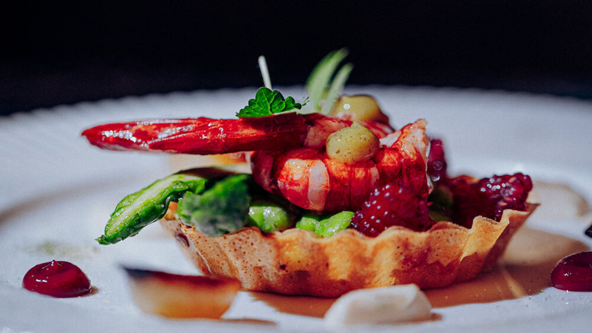 Recette : Fine tarte de Gamberoni, royale de crustacés, purée d’amande et gel citron